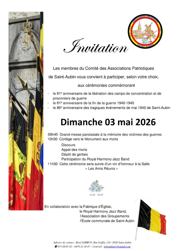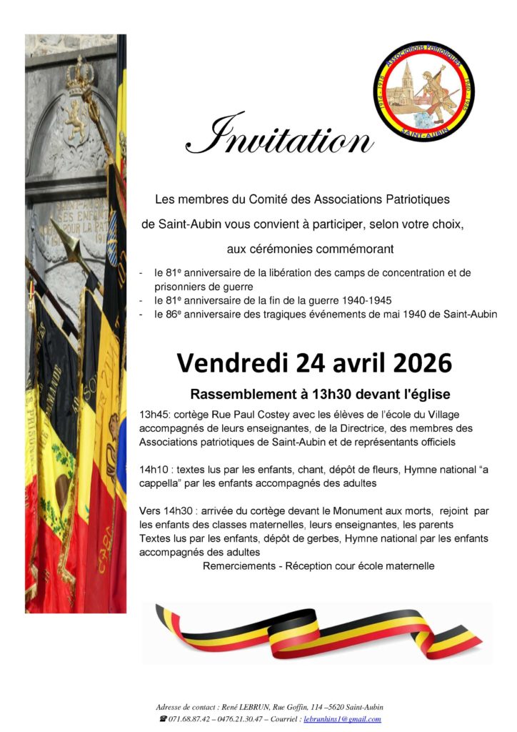 À l’occasion des commémorations du 8 mai, les Associations Patriotiques de Saint-Aubin vous invitent à participer à deux moments de recueillement et de transmission, organisés en collaboration avec les écoles et les acteurs locaux.