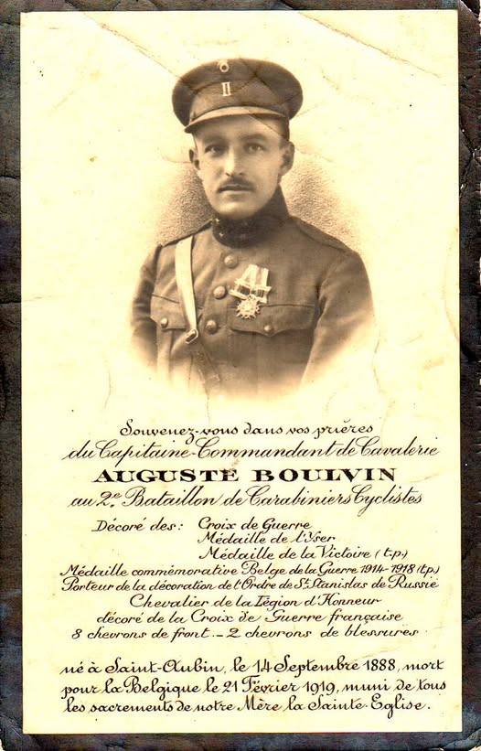 …quelques extraits du livret d’hommage rendus par ses compagnons, hauts-gradés et subordonnés : Auguste Boulvin est né le 14 septembre 1888, en la vénérable demeure qui nous surplombe, alors communément appelée « Ferme Boulvin » – Il est le fils d’Eugène Boulvin et de Marie Poncelet – 3e d’une fratrie de six enfants.